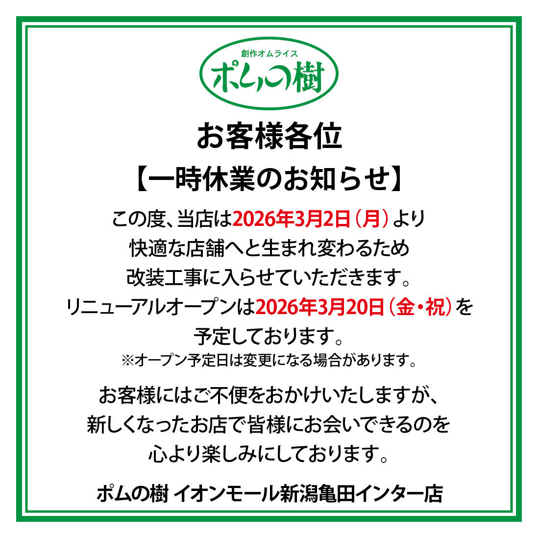 ■店舗改装のお知らせ:ポムの樹 オンモール新潟亀田インター店の店舗改装につきまして